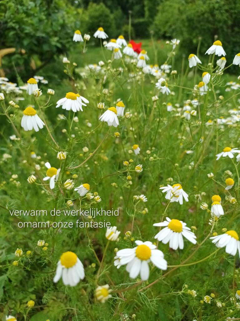 Vanaf de beginjaren is kamille thee drinken tegen buikkrampen en nervositeit. Een donkere tijd kan lichter aanvoelen. De geur bedwelmde me in zijn zoetigheid. Zorgt voor een omarming in een vragende tijd of het moederschap voor mij zou zijn weggelegd. Kamille hoort bij mijn verwarmende herinneringen aan het hangen in het park met vrienden en gezelligheid. Terugdenken aan de vele mensen en het plezier dat ik daar heb…… Met een halve traan en soort van melancholie, kijk ik vandaag naar de plek. Die plek in het park, waar we bijna altijd zaten, vanwege de laatste zonnestralen. De kamille, die mijn dochter kalmeert bij het krijgen van haar tandjes en krampjes in haar buikje. Mijn zorgen tot rust brengt.