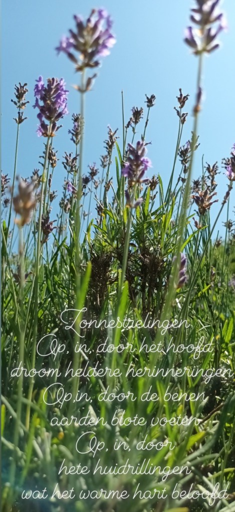 Midden in de paarse vlakte komt de geur ons tegemoet. “Wat doe je nu? Ben je gek geworden ofzo?” Verdwaasd door het moment komt een vlaag van rust over me heen en zeg tegen hem: “Uitstappen alsjeblieft. Het stopt hier, ik ben er klaar mee.” Bij het wegrijden staat hij in de achteruitkijkspiegel in volle verbazing tussen de paarse vlaktes.